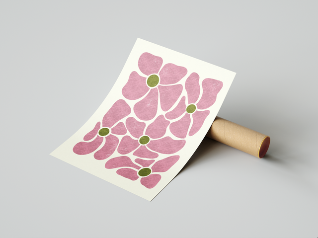 Pink and green flowers print on an off-white background. Printed on quality archival paper and packaged safely.